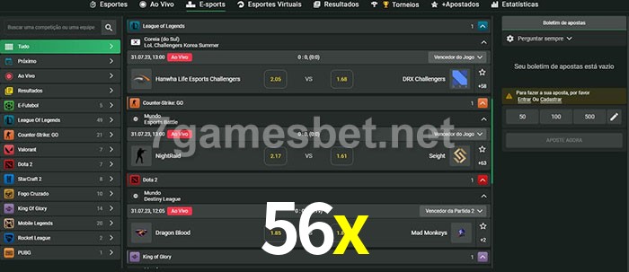 O 56x oferece uma grande seleção de opções de apostas em e-sports com probabilidades competitivas